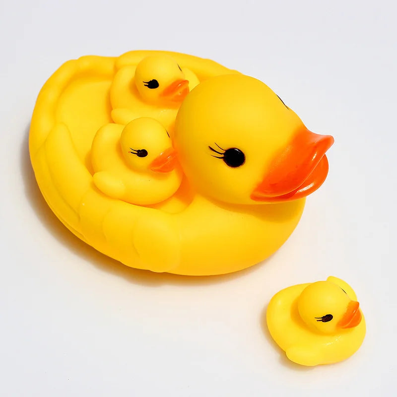 A family of cute ducklings (mother duck and 3 ducklings), you can let them play in the water and take a bath with the baby! It will beep when you squeeze it lightly! So fun!