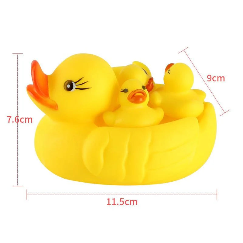 -Description: With a little pinch, the duck mother will quack with three duck babies. Whether it is in the baby's bath, swimming or normal games, it can be played. It is a toy for the baby to bathe and swim.